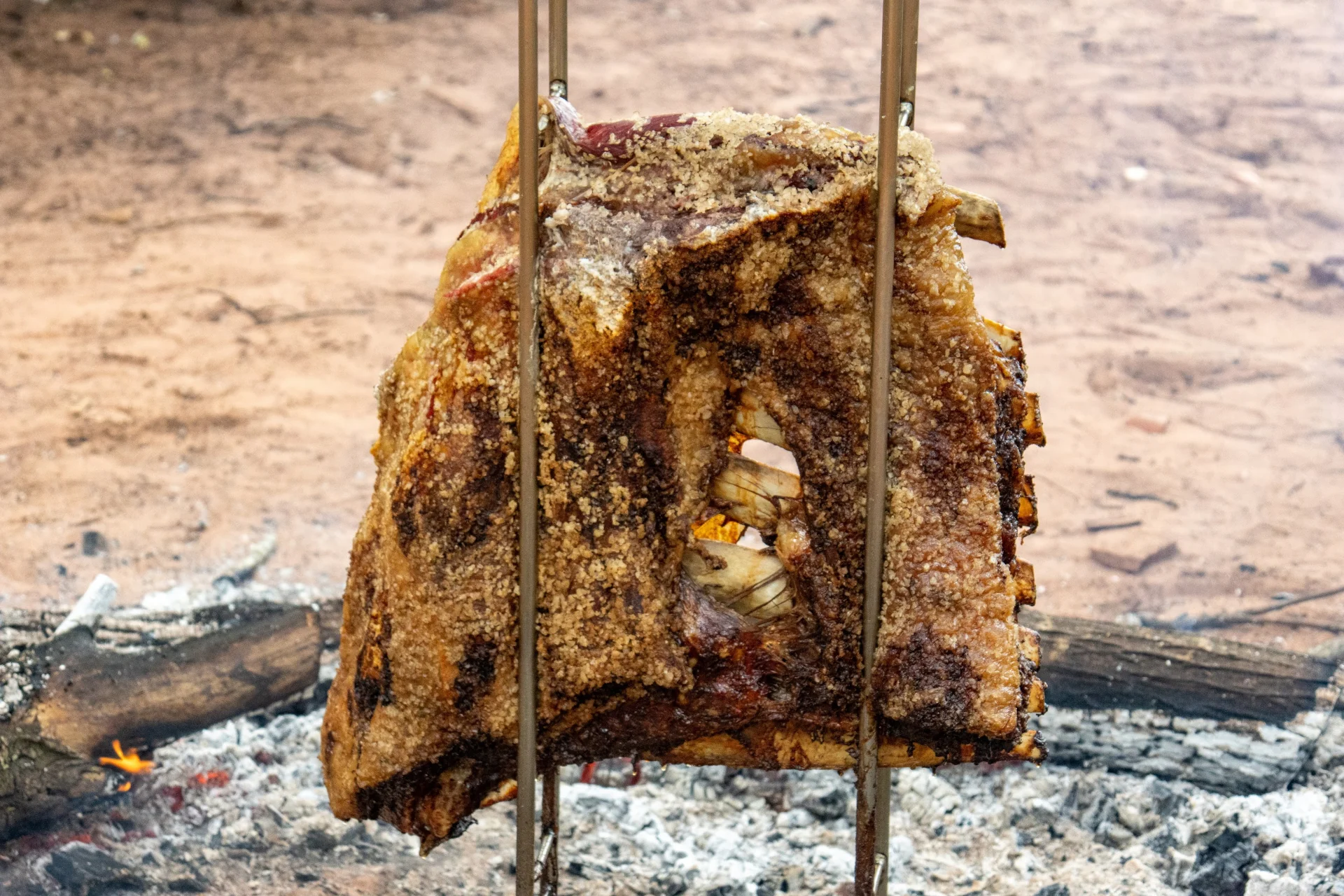 After that, the job is mostly to keep feeding the fire with logs and watching the progress. Over time, the meat starts to open up and the bones begin to loosen. Another useful tip is to add more fire if there is wind coming from behind the ribs, because the heat helps warm the bones, and the bones also help cook the meat from the inside.