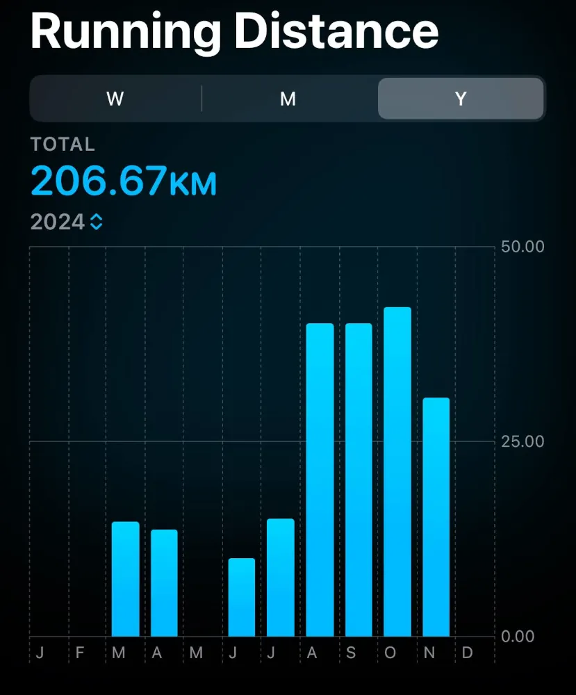 Monthly running distance measured by Apple Watch