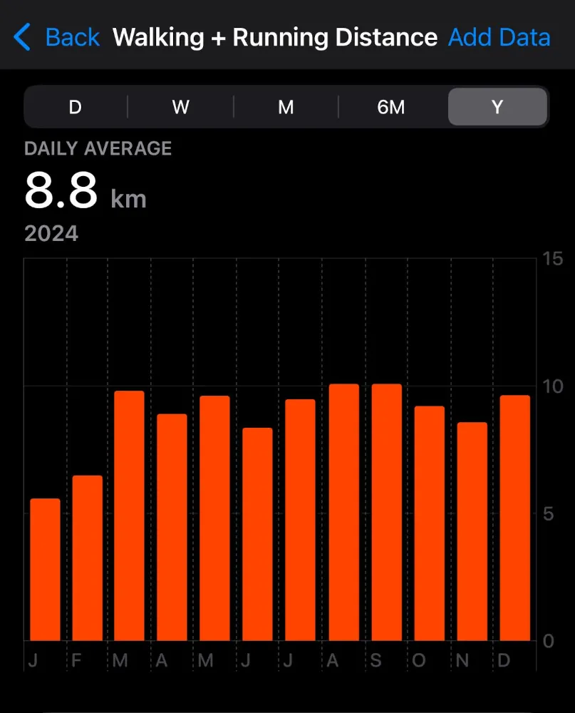 Daily average of walking + running distance in 2024
