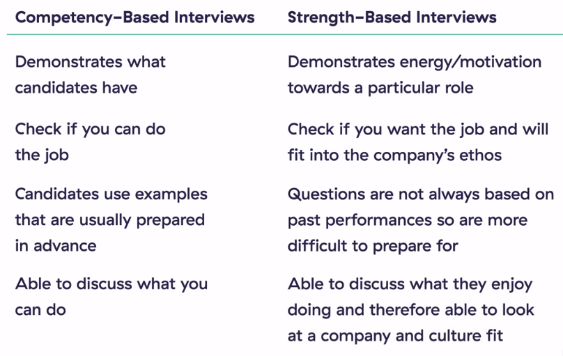 There are usually two types of interviews, competency-based interviews, and strength-based Interviews. The table below summarizes the differences.
